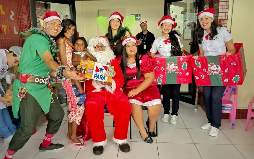 Crianças internadas no Hospital Regional Dr. Abelardo Santos (HRAS), em Icoaraci, distrito de Belém, viveram uma tarde diferente nesta segunda-feira (22) com a visita do Papai e da Mamãe Noel. A ação marcou a entrega de presentes solicitados pelos próprios pacientes em cartinhas escritas à mão e adotadas por colaboradores da unidade.