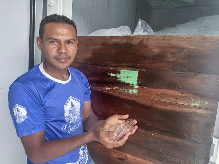 A estrutura, chamada “Gelo Caboclo”, tem capacidade de produzir até uma tonelada de gelo por dia e armazenar até 20 toneladas, operando com um sistema de placas fotovoltaicas e baterias que garantem funcionamento contínuo.